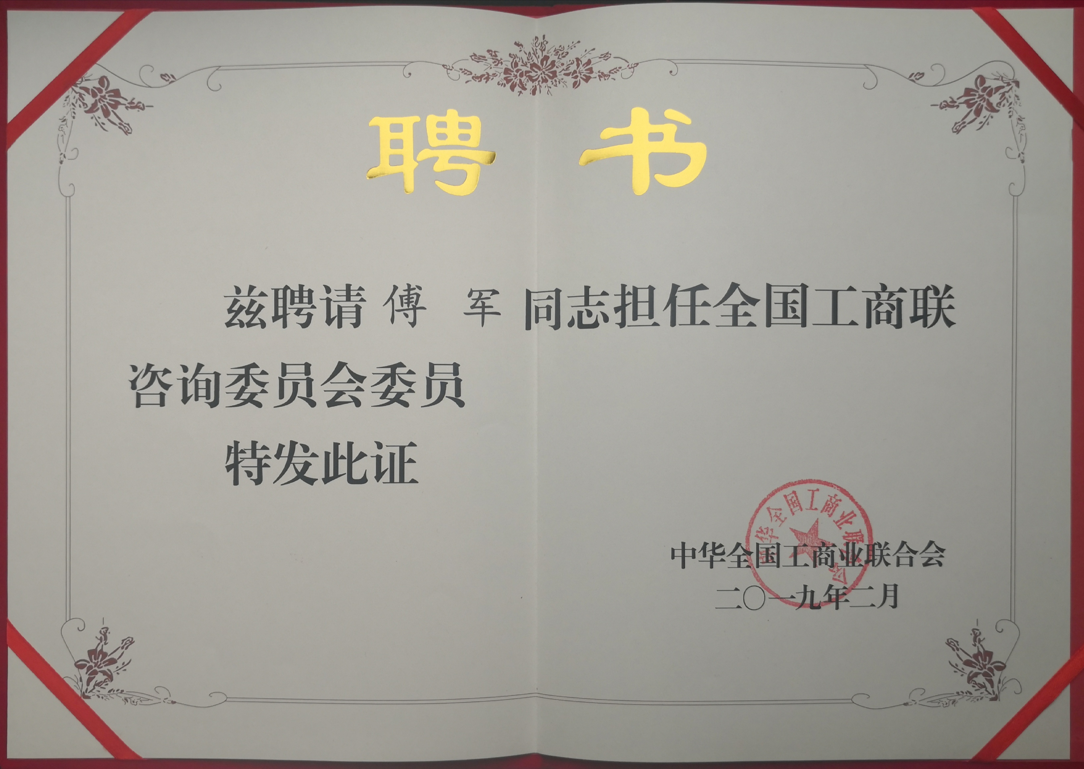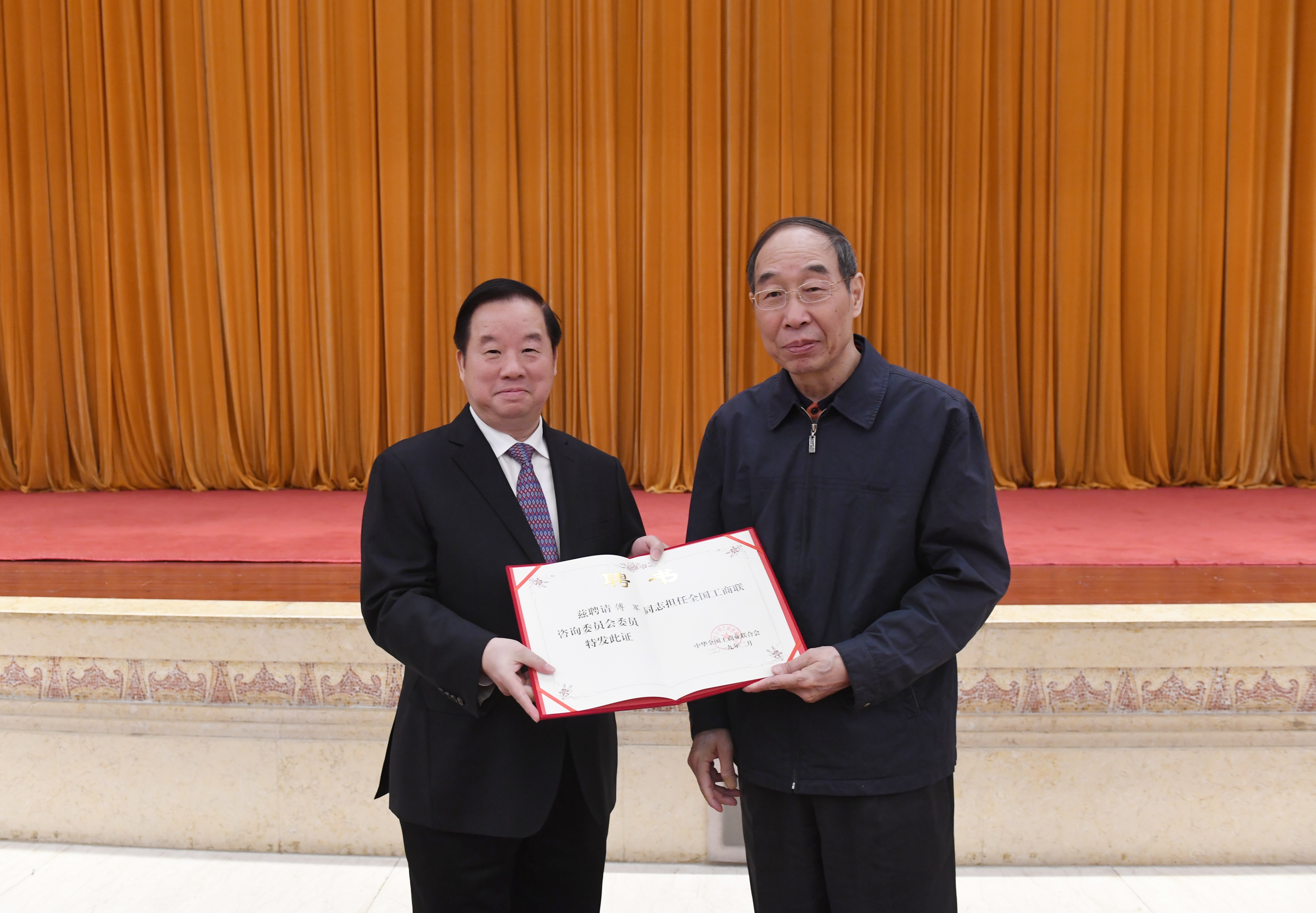 2月26日上午,全國工商聯咨詢委員會成立大會暨第一次專題座談會在中央統戰部禮堂召開。新華聯集團董事局主席兼總裁傅軍出席會議并被聘任為咨詢委員會委員。馬云、馬化騰、柳傳志、董明珠等代表被聘任委員和企業家發言,中央書記處書記、統戰部部長尤權向委員頒發聘書并講話。
