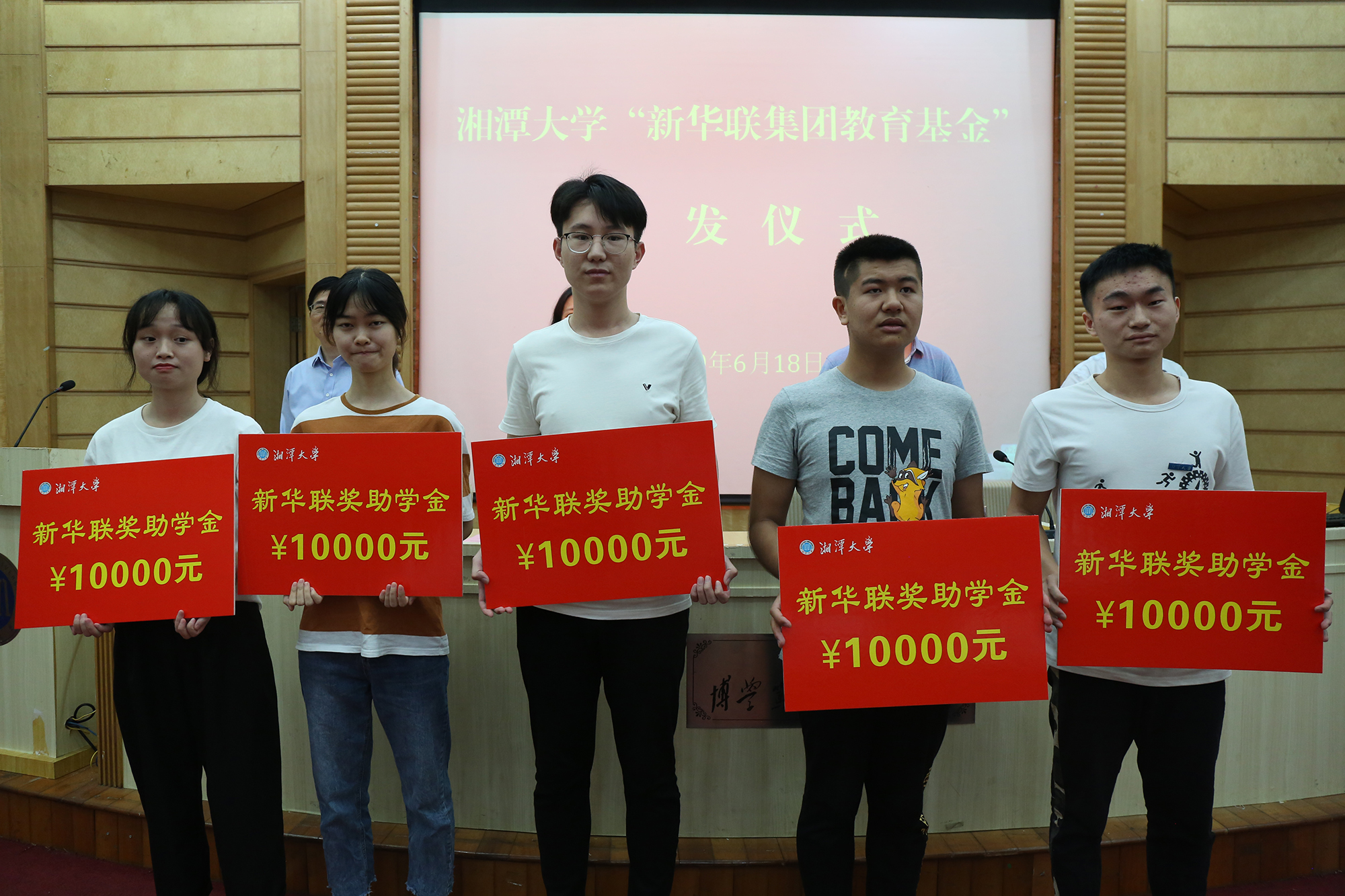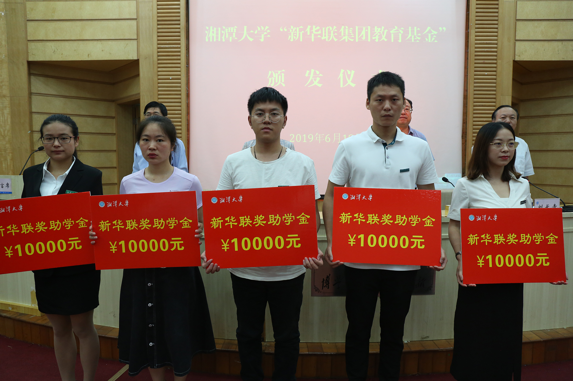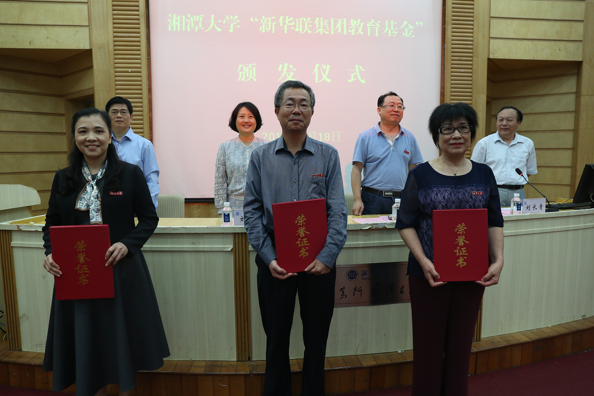 6月18日,湘潭大學首屆“新華聯集團教育基金”頒獎典禮在該校圖書館報告廳隆重舉行。新華聯集團高級副總裁劉靜、高級助理總裁楊運輝代表集團出席此次活動,并與湘潭大學副校長劉建平為楊華、戴友芝、朱礫等3位教師頒發了2018年“湘潭大學·新華聯杰出教學貢獻獎”,每人獎勵12萬元;為孫豐國、李成福等2位教師頒發了2018年“湘潭大學·新華聯教學名師獎”,每人獎勵6萬元;為鄔欣言、張偉偉、侯晟、揭嘉、王秀鋒等5位教師頒發了2018年“湘潭大學·新華聯青年教學標兵獎”,每人獎勵2萬元;為郭彩虹、李麗梅、張海雪等100名優秀貧困大學生頒發了2019年“湘潭大學·新華聯集團教育基金助學金”,每人獎勵10000元。湘潭大學副校長劉長青與該校黨委辦公室、校長辦公室、宣傳部等校屬有關部門負責人,各學院學生工作負責人,以及獲獎教師、受助學生代表等300余人共同見證了頒獎活動。