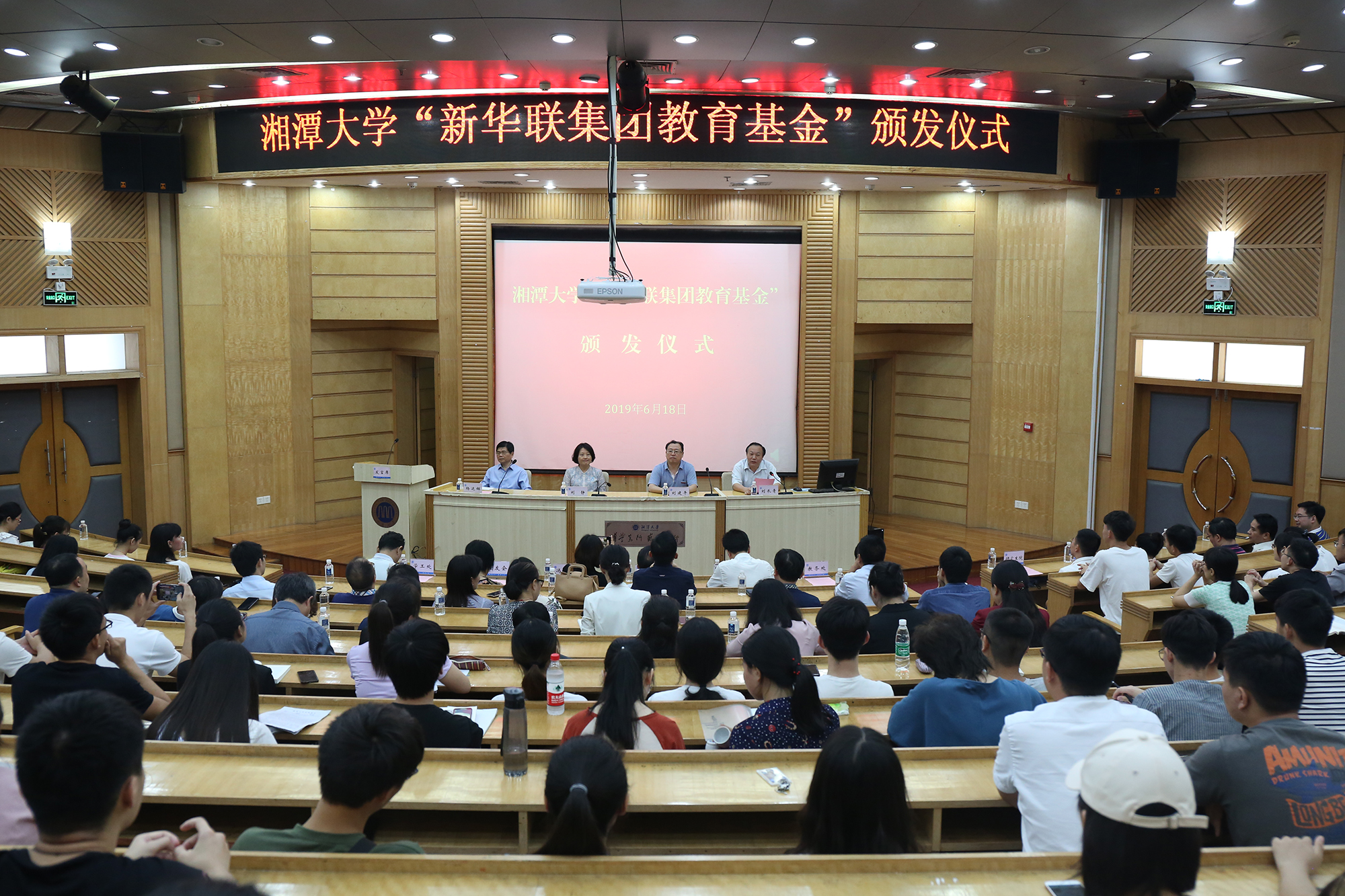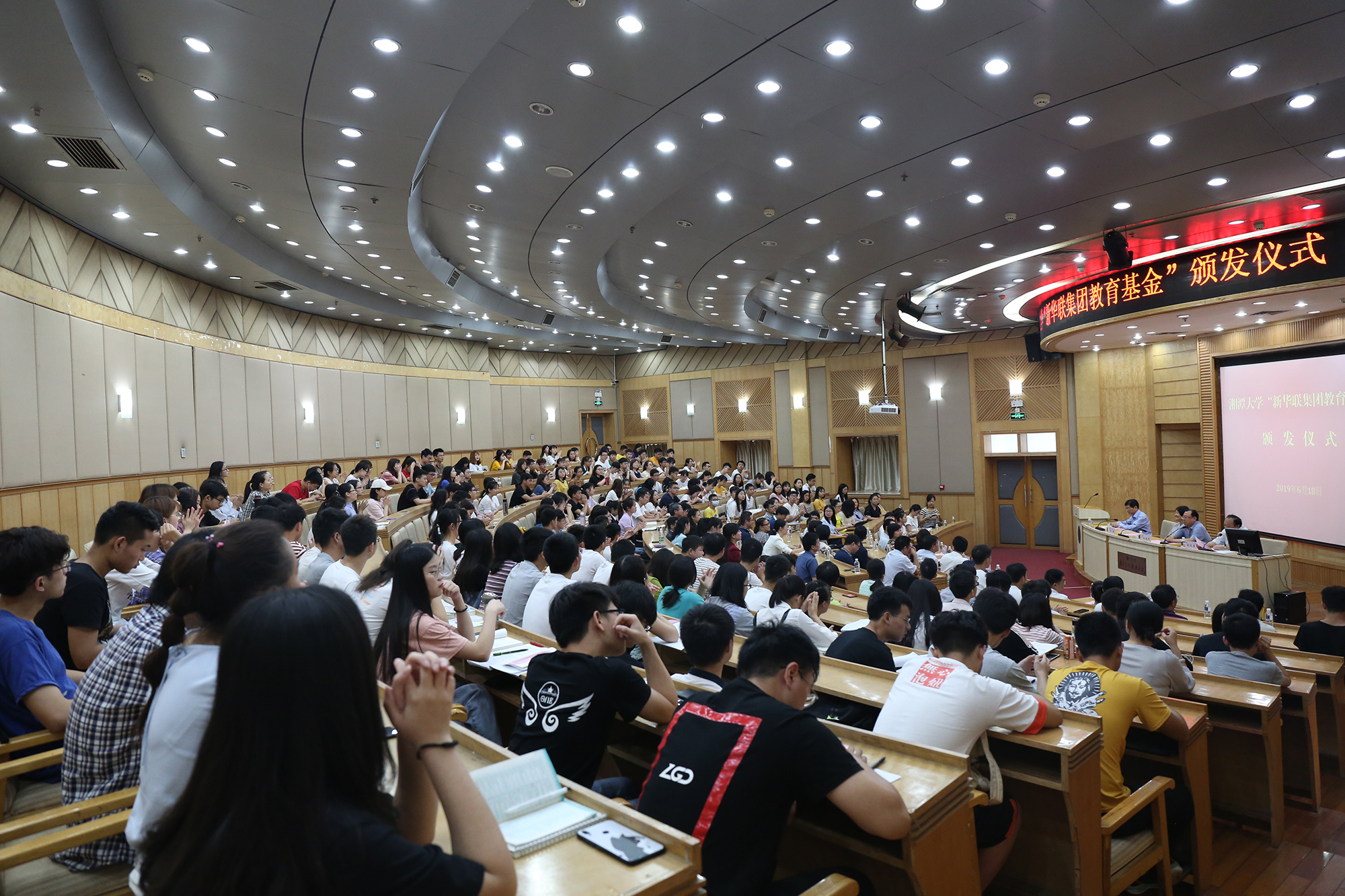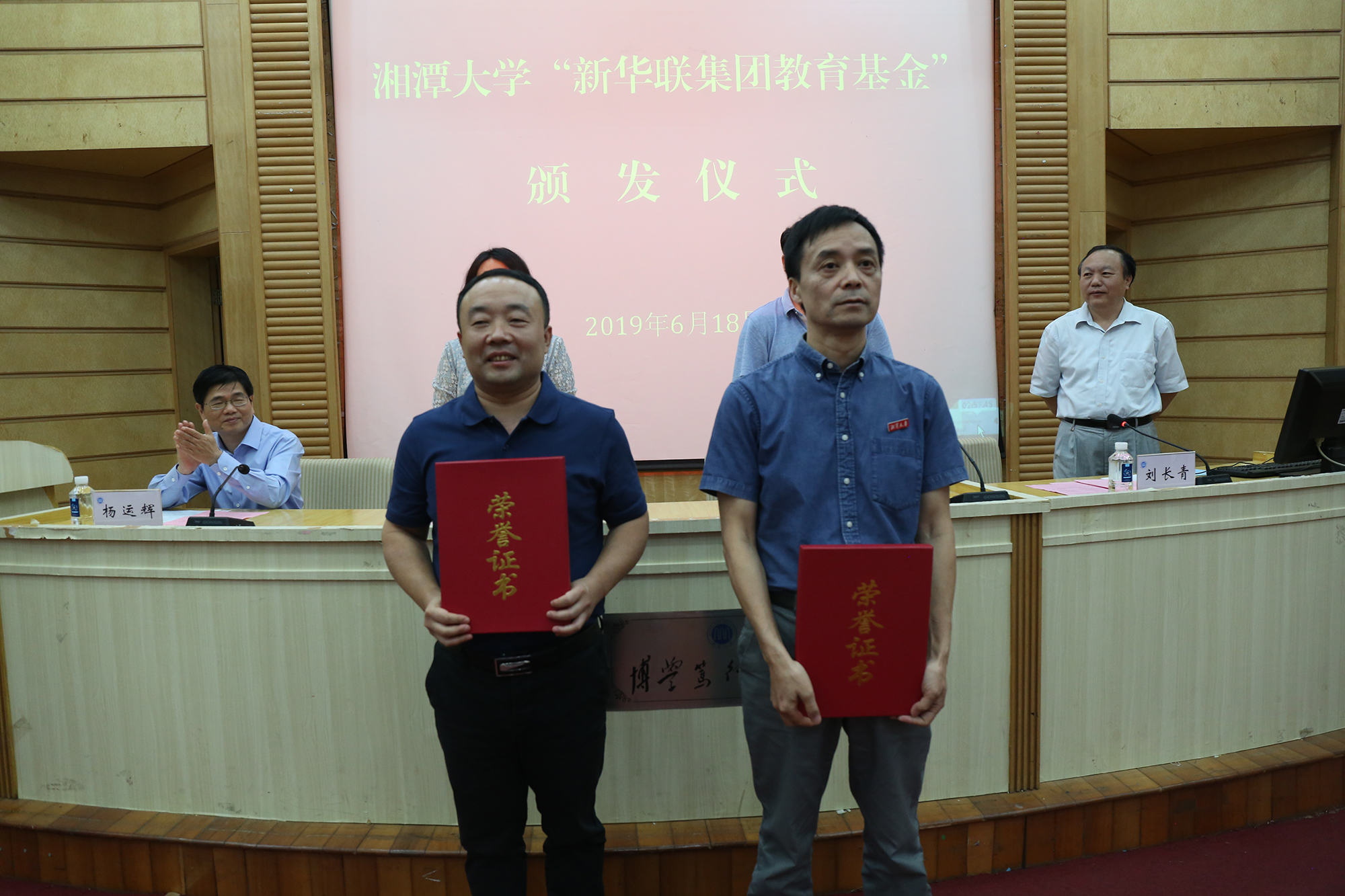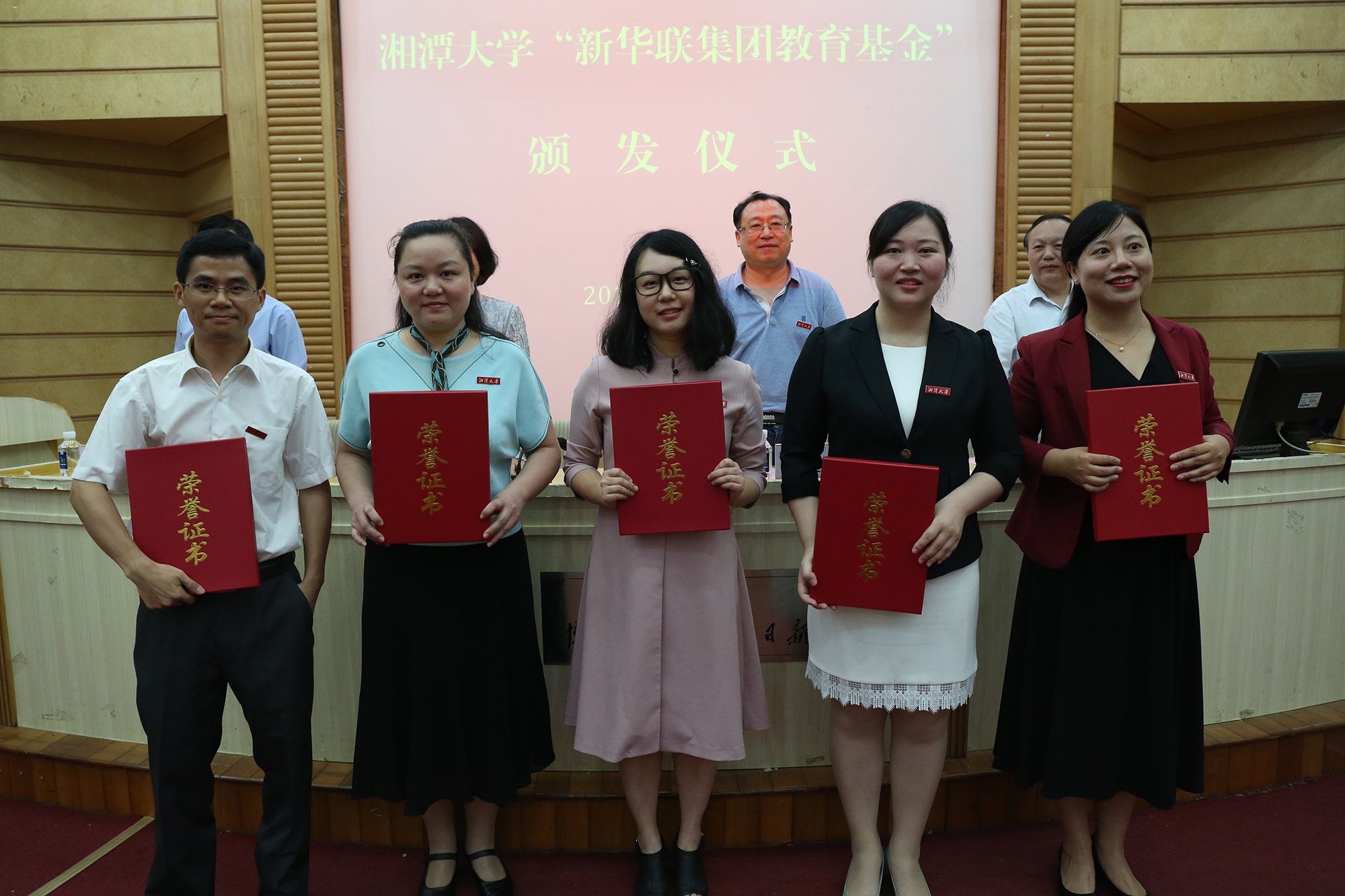 6月18日,湘潭大學首屆“新華聯集團教育基金”頒獎典禮在該校圖書館報告廳隆重舉行。新華聯集團高級副總裁劉靜、高級助理總裁楊運輝代表集團出席此次活動,并與湘潭大學副校長劉建平為楊華、戴友芝、朱礫等3位教師頒發了2018年“湘潭大學·新華聯杰出教學貢獻獎”,每人獎勵12萬元;為孫豐國、李成福等2位教師頒發了2018年“湘潭大學·新華聯教學名師獎”,每人獎勵6萬元;為鄔欣言、張偉偉、侯晟、揭嘉、王秀鋒等5位教師頒發了2018年“湘潭大學·新華聯青年教學標兵獎”,每人獎勵2萬元;為郭彩虹、李麗梅、張海雪等100名優秀貧困大學生頒發了2019年“湘潭大學·新華聯集團教育基金助學金”,每人獎勵10000元。湘潭大學副校長劉長青與該校黨委辦公室、校長辦公室、宣傳部等校屬有關部門負責人,各學院學生工作負責人,以及獲獎教師、受助學生代表等300余人共同見證了頒獎活動。